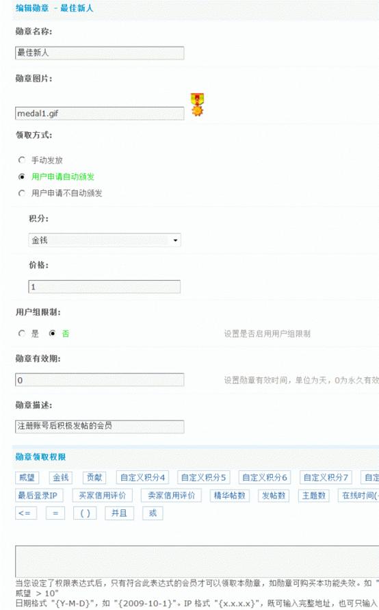 勋章领取权限:当你设定了权限表达式后,只有符合此表达式的会员才可以领取本勋章。如 "posts > 100 and extcredits1 > 10" 表示 "发帖数 > 100 并且 威望 > 10"