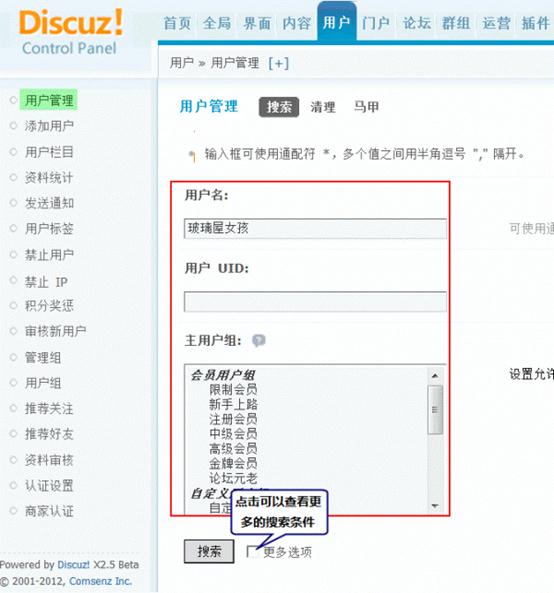 1、管理用户(编辑会员的资料、用户组、权限、积分,授予会员勋章,查找马甲、禁止用户以及删除会员等);