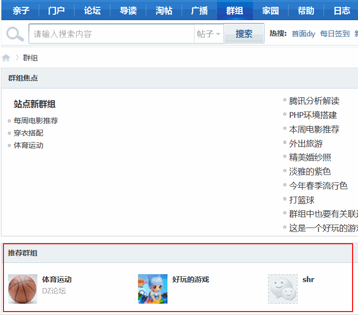 推荐群组:填写要推荐到群组首页的群组ID,以英文逗号“,”分隔,最多显示8个,如不足会自动补充积分最高的群组。填写后在前台的显示效果如下: