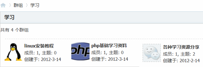 列出了群组名称、帖子数、主题数、成员数以及创建者,点击创建者可以直接跳转到该会员的个人空间。点击“详情”可以直接跳转到群组管理页面。