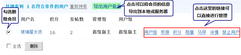 1、管理用户(编辑会员的资料、用户组、权限、积分,授予会员勋章,查找马甲、禁止用户以及删除会员等);