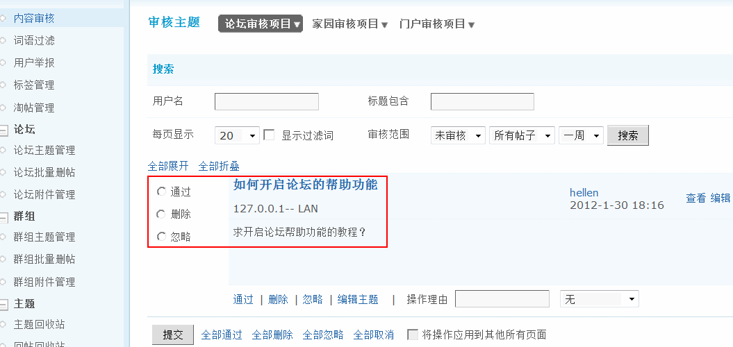 2、批量操作:可以点击下面的全部通过,全部删除,全部忽略,全部取消进行新主题的批量操作。也可以点击每个需要审核的主题左边的单选框进行单个审核。