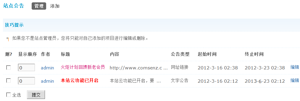 管理人员添加好的公告,可以在这里统一管理,如果你不是站点管理员,你将只能对自己添加的项目进行编辑或删除。