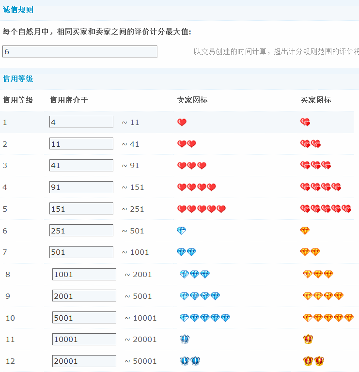 系统内置的诚信规则主要是用来衡量在站点进行商品交易的买卖双方的信用度,用户可将卖家的信用评价作为判断该卖家信誉好坏的重要依据,也大大提高了在网络交易中的安全性。买卖双方的信用图标,按照默认的信用度值顺序递增为心形、钻石、皇冠,站长也可自行定义信息度增长范围和信息图标,并可限制每个自然月中,相同买家和卖家之间的评价计分最大值。