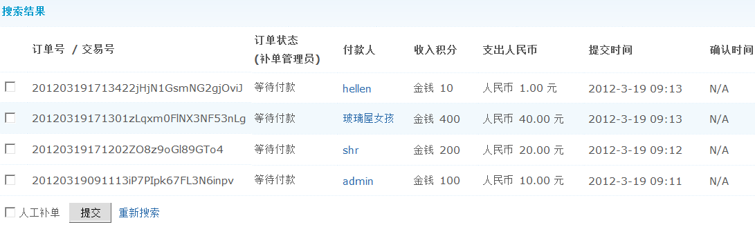 2、成功人工补单:用户支付有问题,可以由管理员在这里进行人工补单,补单后下方将出现补单管理员的用户名。