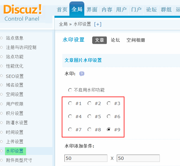 二、论坛附件图片水印设置和空间相册图片水印设置同文章图片水印设置是一样的。