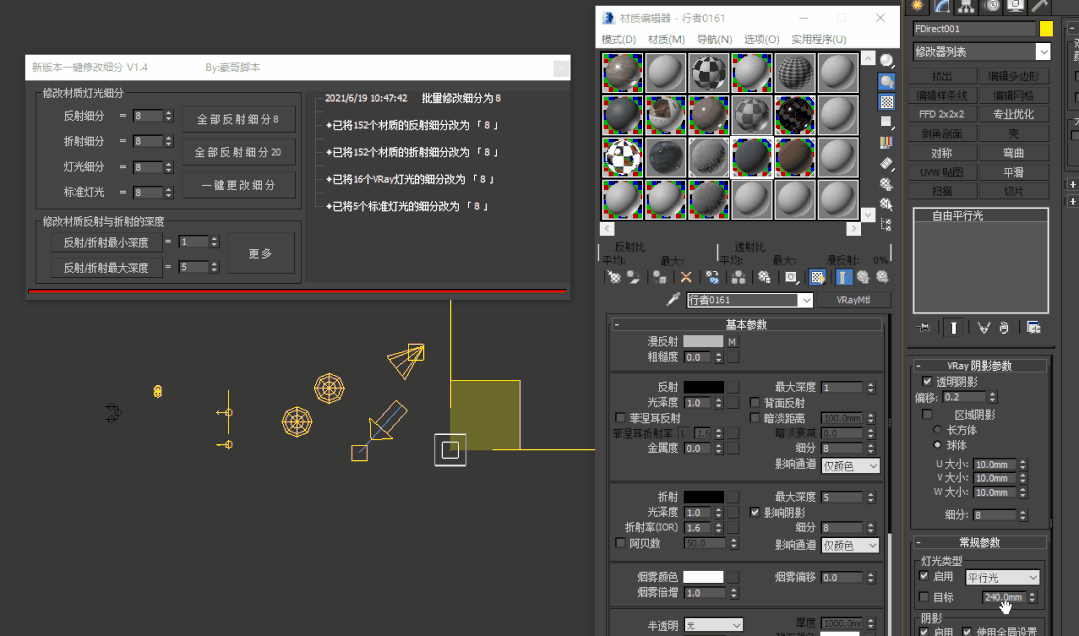 1)一键修改场景反射材质,折射材质,灯光细分,标准灯光细分