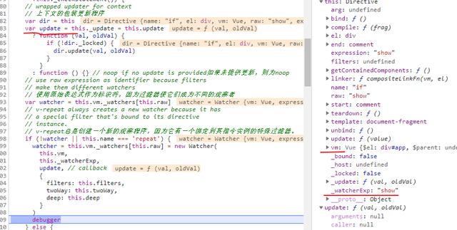 因为vue指令很多,功能也很多,所以会有很多针对一些情况的特殊处理,这些逻辑如果不是对vue很熟悉的话一时间是看不懂的,所以我们只看一些基本逻辑。