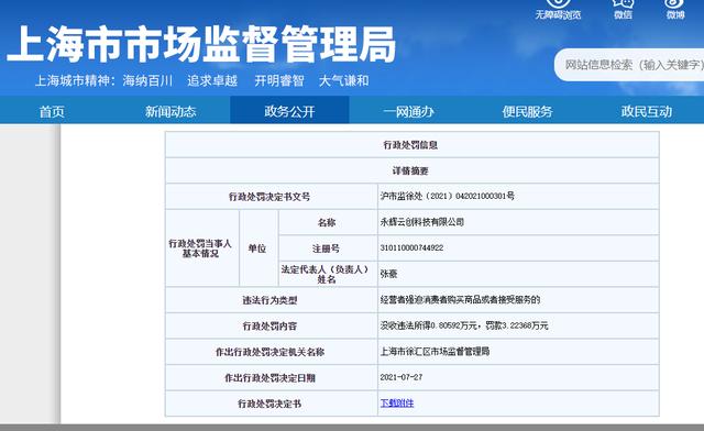 IT之家相识到,据上海市市场监管局网站显示,克日,永辉生活关联公司永辉云创科技有限公司新增行政处罚信息,因“强迫消耗者购买商品或者接受服务”,被上海市徐汇区市场监视管理局充公违法所得 8059.2 元,罚款 3.22368 万元。