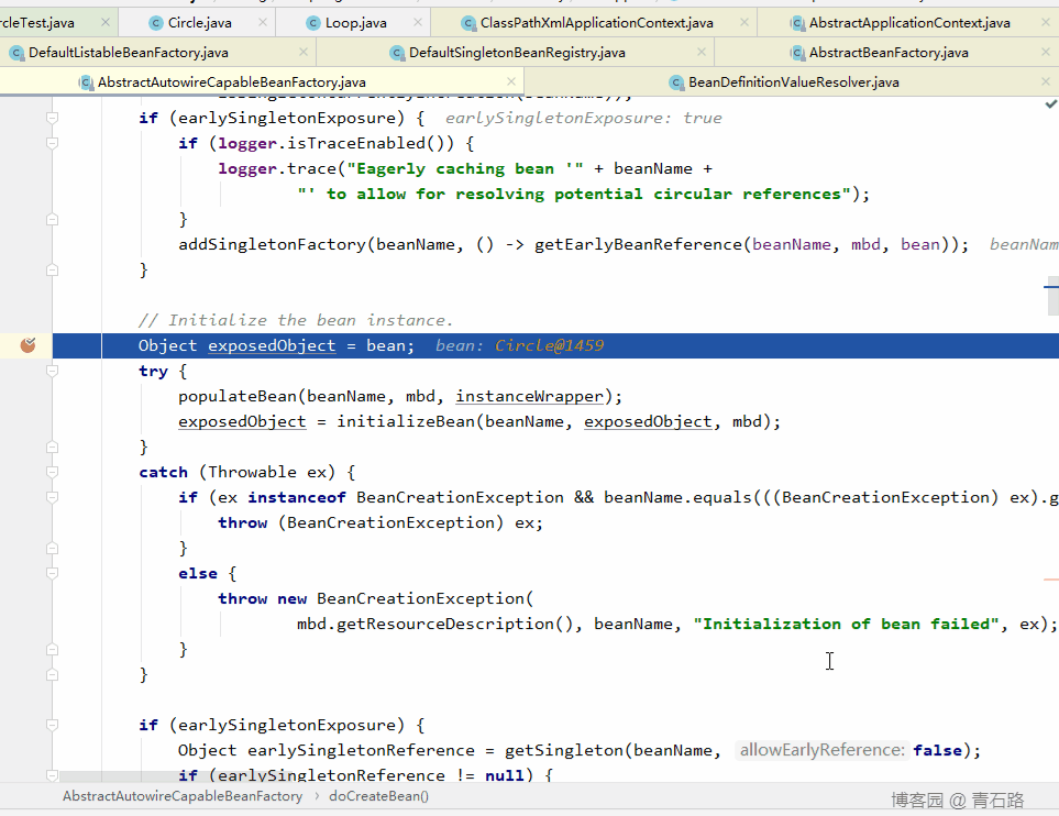 对 circle 对象的属性 loop 进行填充的时间,去 Spring 容器中找 loop 对象,发现没有则进行创建,又来到了认识的 createBean