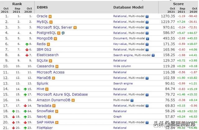 排名前二十的数据库绝大多数都是关系型数据库,由此可见关系型数据库在市场上仍旧是主流数据库。