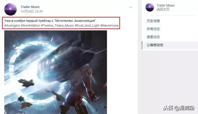 上次“《复联4》副标题是湮灭”的爆料就发生在10月底。一家俄罗斯的社交网站上,有一个叫做“Trailer Music”的账号分享了《霍比特人:五军之战》预告片的配乐,并配上了这么一句话:“这个音乐将在11月份跟《复仇者联盟4:湮灭》一起上线。”