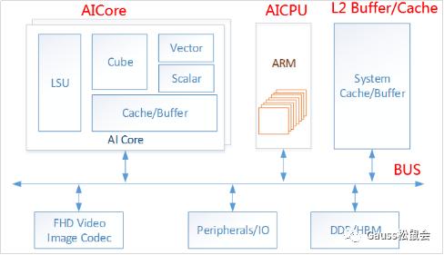 注: BUS表示计算机系统中总线,用于互联芯片上多个子单位,是行业术语。Vector是矢量处理单位,用于将多个同一数据范例封装的数据包一次性处理,如(1,3,10,11)。Cube是矩阵处理单位,用于对矩阵数据布局举行线性代数操纵,如点积、加减等。Cache是处理器上的高速缓存。Scalar是标量处理单位,用于对简单数据布局举行计算,如Int 1,Float 0.35等。HBM 是高带宽内存,行业术语。Peripheral/IO 是周边装备总线,用于将处理器和外部存储器等器件互联。FHD Video是高清视频,Image Codec是图像编解码器。